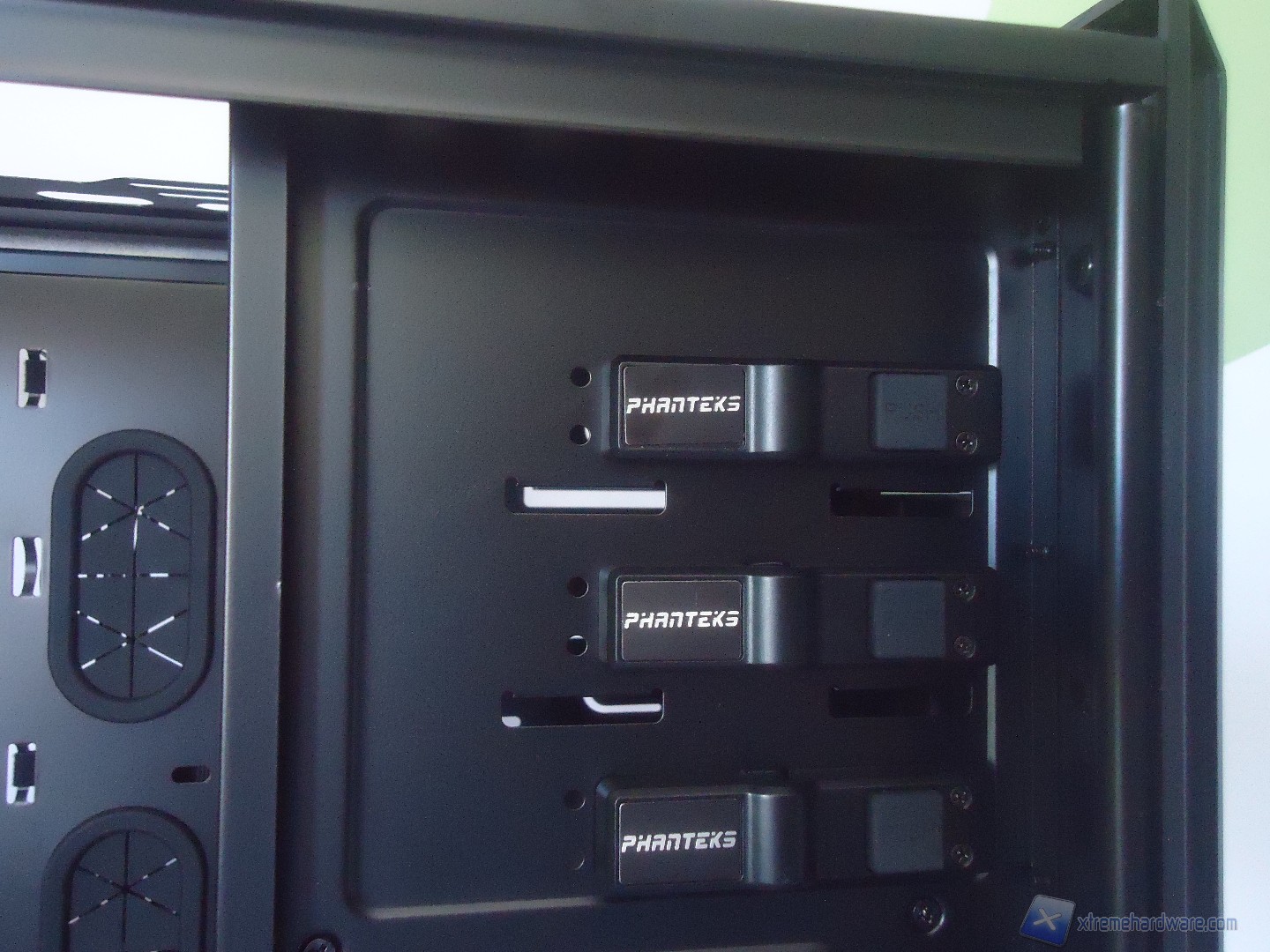 Per quanto riguarda il montaggio di periferiche nei bay frontali,  come possiamo vedere ci sono i cage degli hard disk e i 3 bay esterni da 5,25”,  con relativo sistema di bloccaggio tool-less (corredati di logo Phanteks); per sbloccare sarà sufficiente premere sul pulsante “push”.