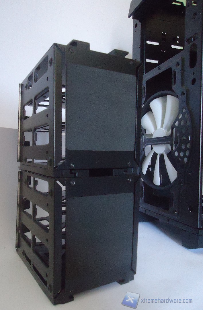 Questa parte del case appare molto ordinata e ben studiata; sotto i bay esterni da 5,25” troviamo il cestello degli hard disk con 4 slitte ognuno. Il cestello può essere rimosso interamente oppure può essere rimossa una delle due gabbie. Per quanto riguarda gli SSD oppure gli hard disk da 2,5”, sono presenti due predisposizioni, una proprio sotto il retro del socket della scheda madre e una più in basso, alle spalle dell’alimentatore.