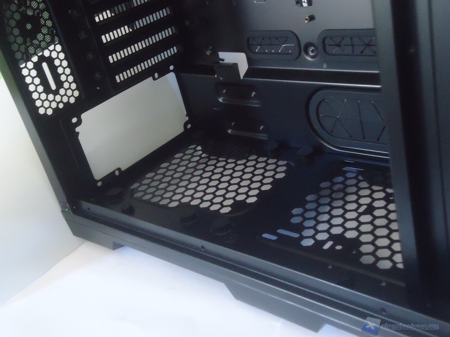 Tolta la copertura possiamo notare come l’alimentatore venga adagiato su dei piedini antivibrazione, nonché la presenza di un ulteriore passacavo gommato per far passare i cavi dell’alimentatore nella parte destra del case. Vi è oltretutto sul fondo del case una predisposizione per montare altre due ventole da 120mm oppure un radiatore da 240mm. Nella foto i filtri antipolvere (mostrati in precedenza) sono stati rimossi per rendere più visibile il fondo del case.