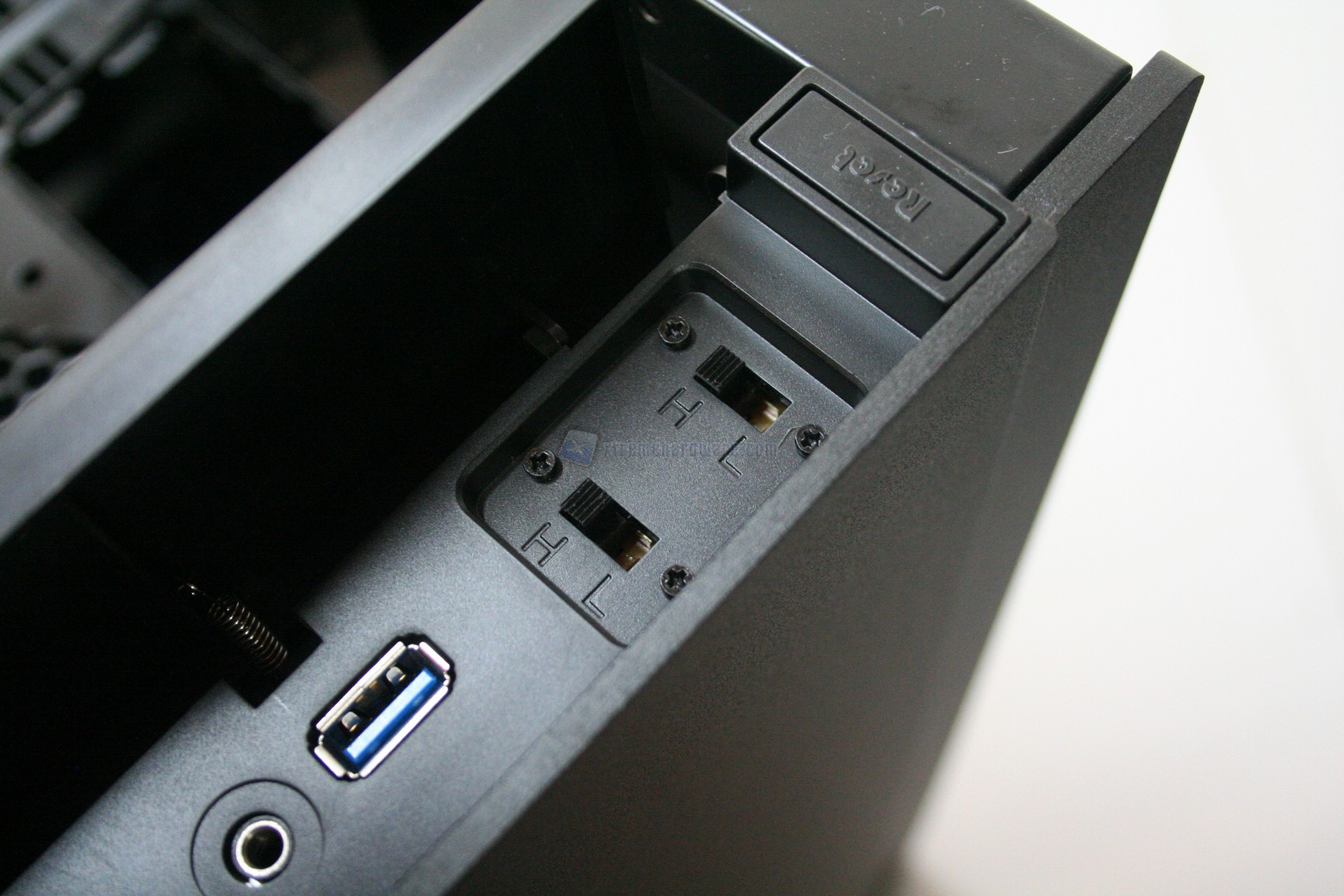 Una delle caratteristiche del'FT05/RV05 è l’assenza di bay da 5.25”, quindi frontalmente troviamo solo un LED di stato centrale (in questo modello con il logo del produttore), e nella parte superiori le connessioni I/O, assieme ai pulsanti di reset, accensione e due rudimentali fan controller con tre selettori cadauno, per le due AP181. Nella parte inferiore, questa volta estraibile lateralmente, troviamo un filtro antipolvere ad innesto con magneti angolari, molto pratico e funzionale.
