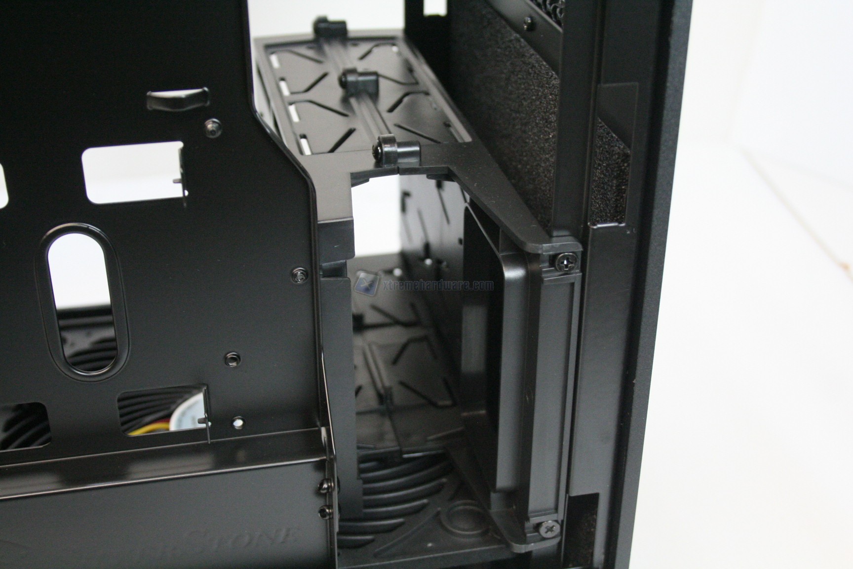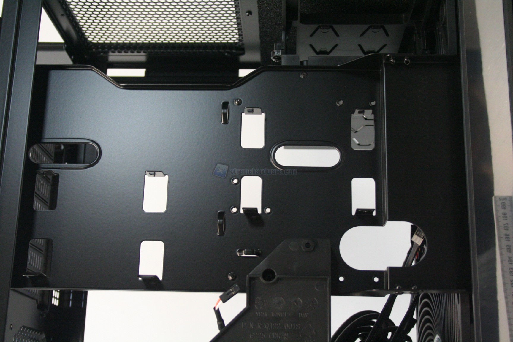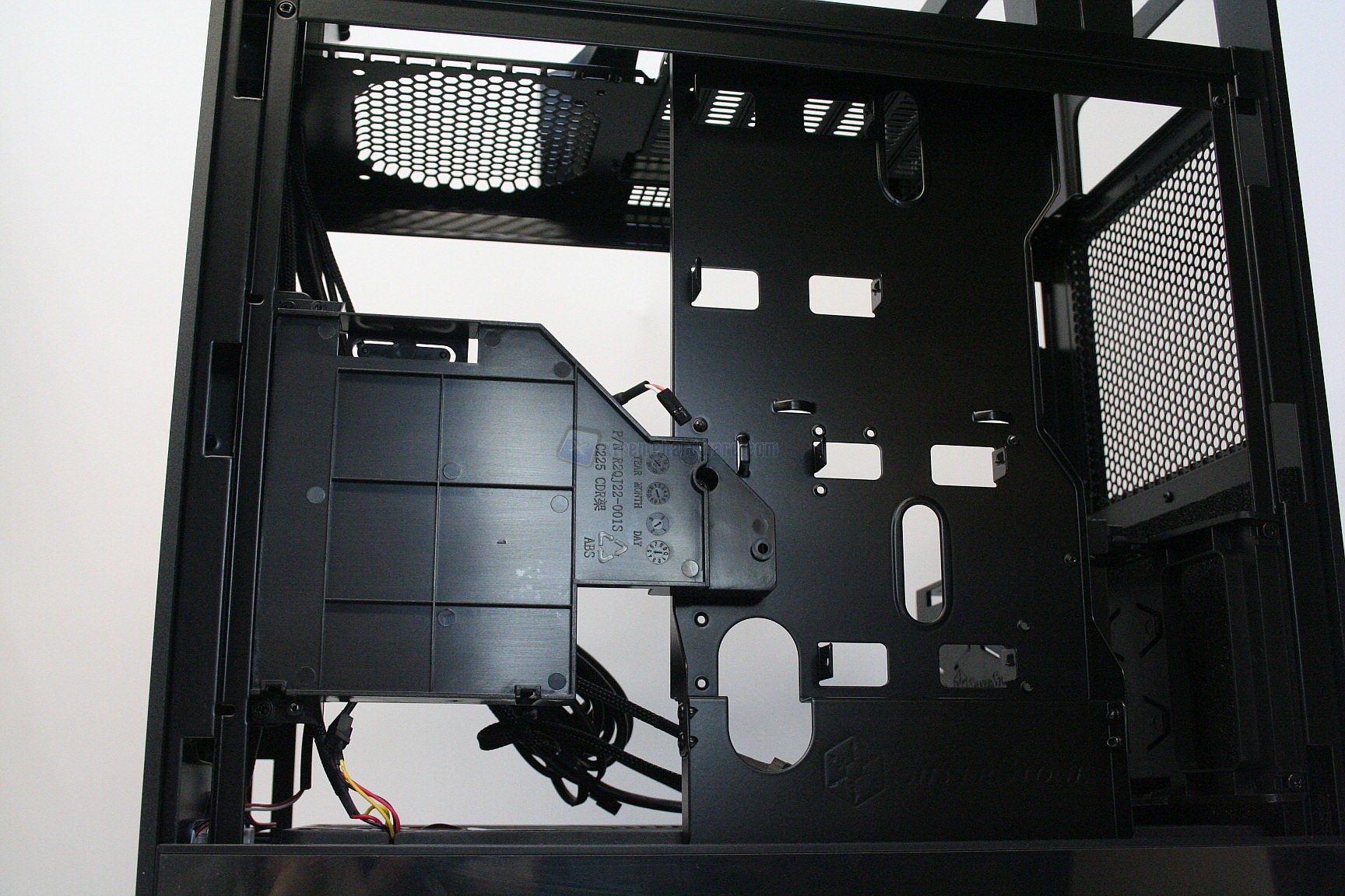 L'interno, per il 95% non differisce da quello dell'RV05, se non per un minuscolo dettaglio relativo al cablaggio. In sostanza è presente un foro addizionale per far passare i connettori SATA, direttamente accanto al molex 24Pin dell'alimentatore. Per questa ragione riporteremo la descrizione precedente: è interamente in acciaio, anche se purtroppo lo spessore delle lamiere è inferiore ai modelli passati. Non che porti ad un problema strutturale, però siamo dell'idea che forse possa essere troppo leggero. Non è ovviamente removibile ma presenta numerosissime aperture posteriori, il che significa che sarà molto difficile che ci siano problemi relativi a compatibilità con sistemi di dissipazione o per il semplice passaggio dei cavi. Nella parte superiore è possibile installare un radiatore a liquido sullo stile del Silverstone TD03 Tundra. Per quanto riguarda la scheda video e la CPU troviamo un'ottima compatibilità, fino a 162mm in altezza, mentre per le VGA si arriva fino a 305mm. Diversamente dal Raven 4, non troviamo sistemi di blocco delle VGA stile Server, oppure per la CPU, che nel caso precedente era posta in una configurazione sullo stile BTX, o ATX inverso (Lo standard BTX in realtà ha diverse altre caratteristiche, non presenti nel Raven4, sebbene la tipologia di dissipazione termica fosse molto simile).