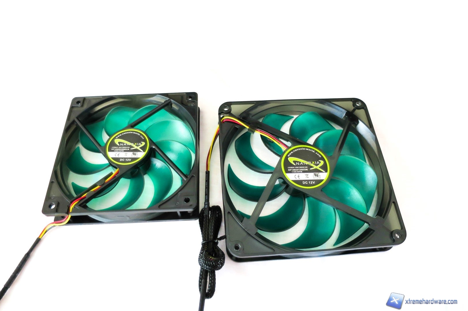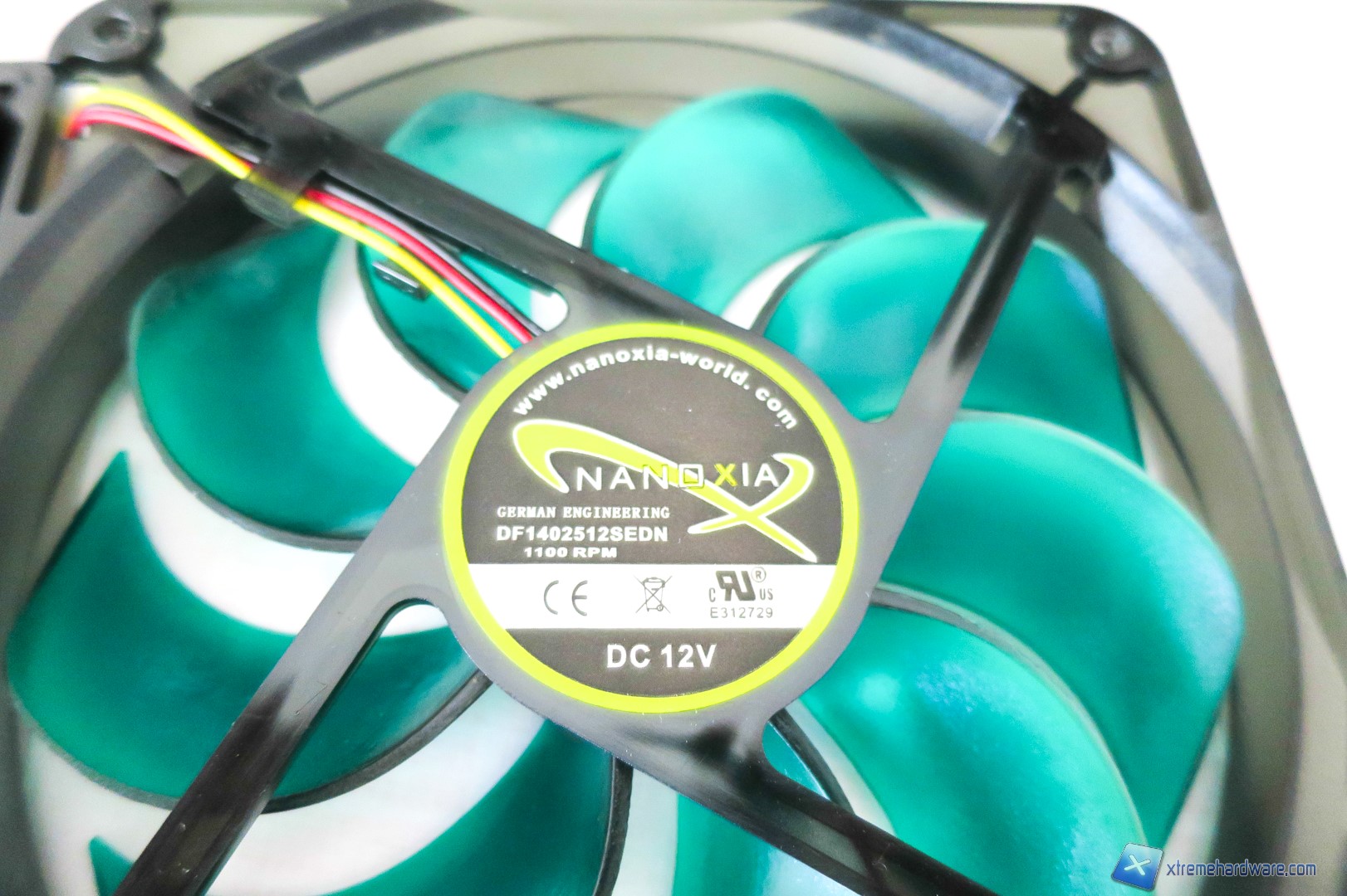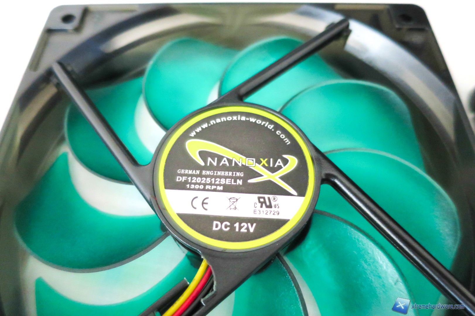 Nel Nanoxia Deep Silence 1 Rev.B di base vengono fornite due ventole da 120mm ed una da 140mm con il classico design e colorazione Nanoxia. I modelli delle ventole sono DF1402512SEDN per il modello da 140mm e DF1202512SELN per il modello da 120mm. La velocità massima delle 120mm si attesta a 1.300RPM mentre il modello da 140mm ha una rotazione massima di 1.100RPM che in abbinamento alla due ventole da 120mm garantirà un valido flusso d'aria all'interno del case.  Le ventole sono standard come design tralasciando la colorazione verde trasparente delle pale leggermente curvate. Sia per il modello da 120mm sia per quello da 140mm abbiamo 9 pale. Queste lavorano a 12V tramite connettore a 3pin e offrono una buona silenziosità in abbinamento ad un’altrettanta buona pressione (60CFM circa per le 120mm e 65CFM circa per la 10mm). I modelli presenti nel case sono comparabili come valori e caratteristiche ai modelli presenti a catalogo Nanoxia.