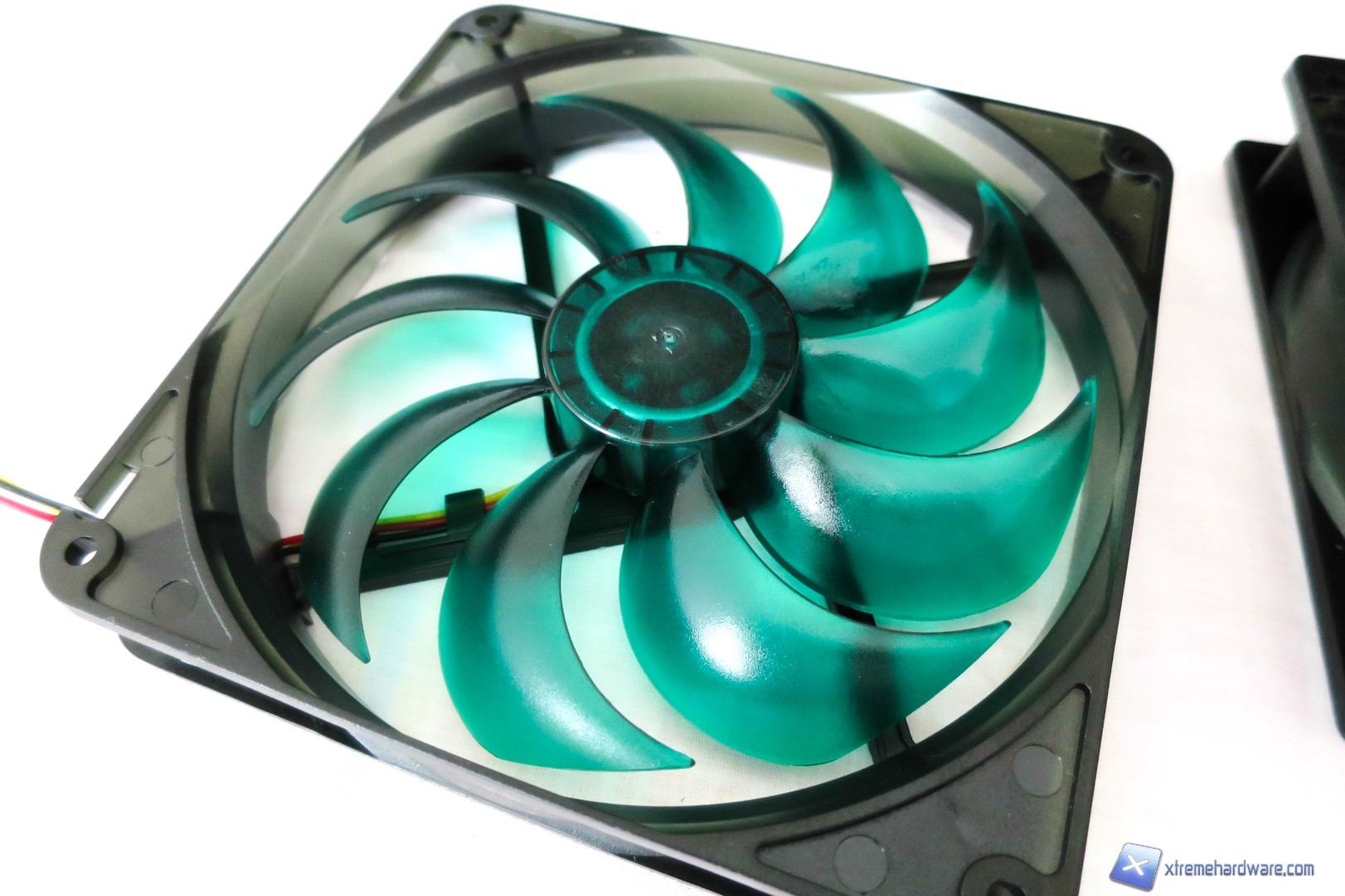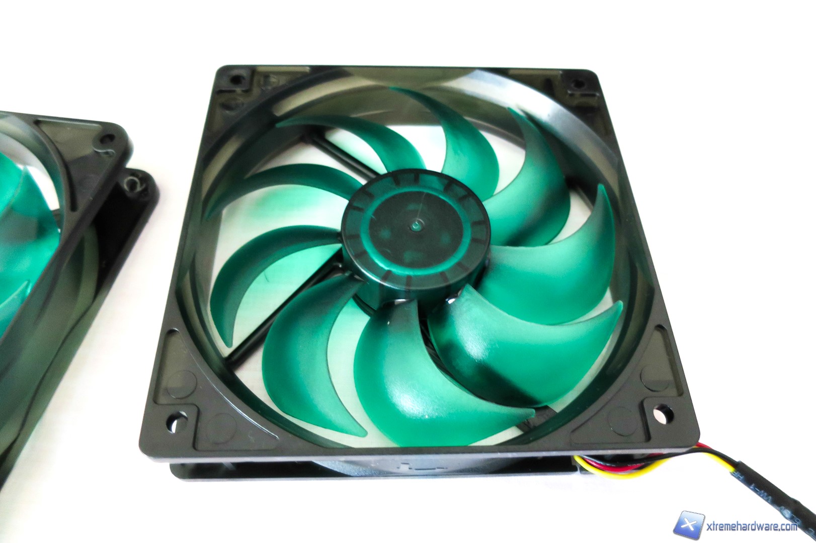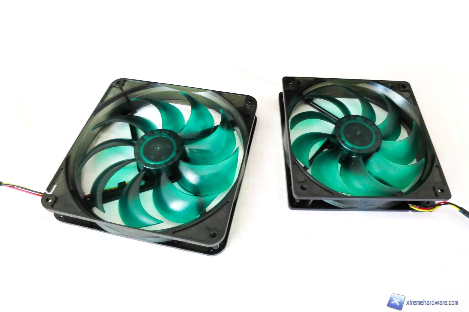 Nel Nanoxia Deep Silence 1 Rev.B di base vengono fornite due ventole da 120mm ed una da 140mm con il classico design e colorazione Nanoxia. I modelli delle ventole sono DF1402512SEDN per il modello da 140mm e DF1202512SELN per il modello da 120mm. La velocità massima delle 120mm si attesta a 1.300RPM mentre il modello da 140mm ha una rotazione massima di 1.100RPM che in abbinamento alla due ventole da 120mm garantirà un valido flusso d'aria all'interno del case.  Le ventole sono standard come design tralasciando la colorazione verde trasparente delle pale leggermente curvate. Sia per il modello da 120mm sia per quello da 140mm abbiamo 9 pale. Queste lavorano a 12V tramite connettore a 3pin e offrono una buona silenziosità in abbinamento ad un’altrettanta buona pressione (60CFM circa per le 120mm e 65CFM circa per la 10mm). I modelli presenti nel case sono comparabili come valori e caratteristiche ai modelli presenti a catalogo Nanoxia.