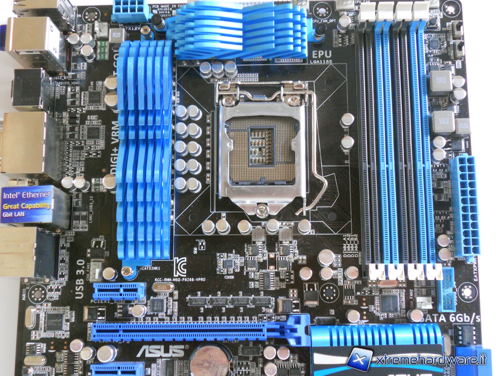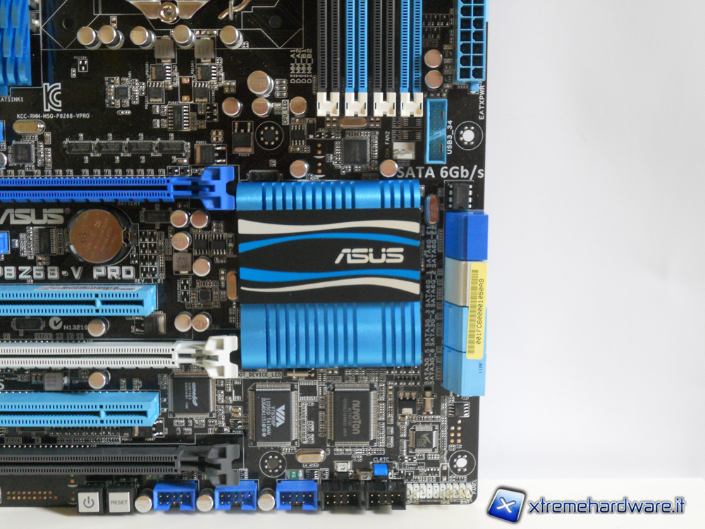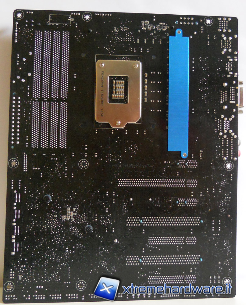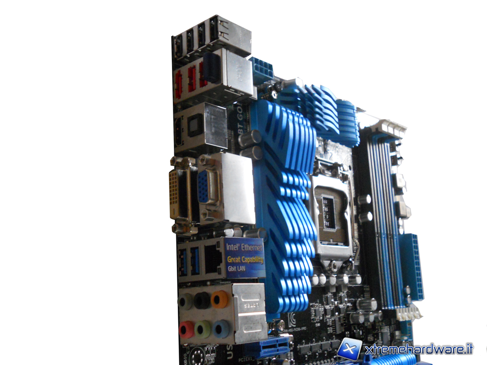 La P8Z68-V PRO si presenta con una colorazione nera con particolari celesti tra cui risaltano, soprattutto per il loro design, i tre corpi dissipanti, questi ultimi sono tutti facilmente removibili infatti due sono fermati attraverso un sistema Push-to-Pin mentre il più grande, adibito al raffreddamento di una parte della circuiteria d'alimentazione, è fissato attraverso delle viti ed è l'unico con backplate sul retro della motherboard. Sarà quindi molto facile smontare i dissipatori per pulizia o per manutenzione o per i più esigenti per permettere il montaggio di waterblocks appropriati.