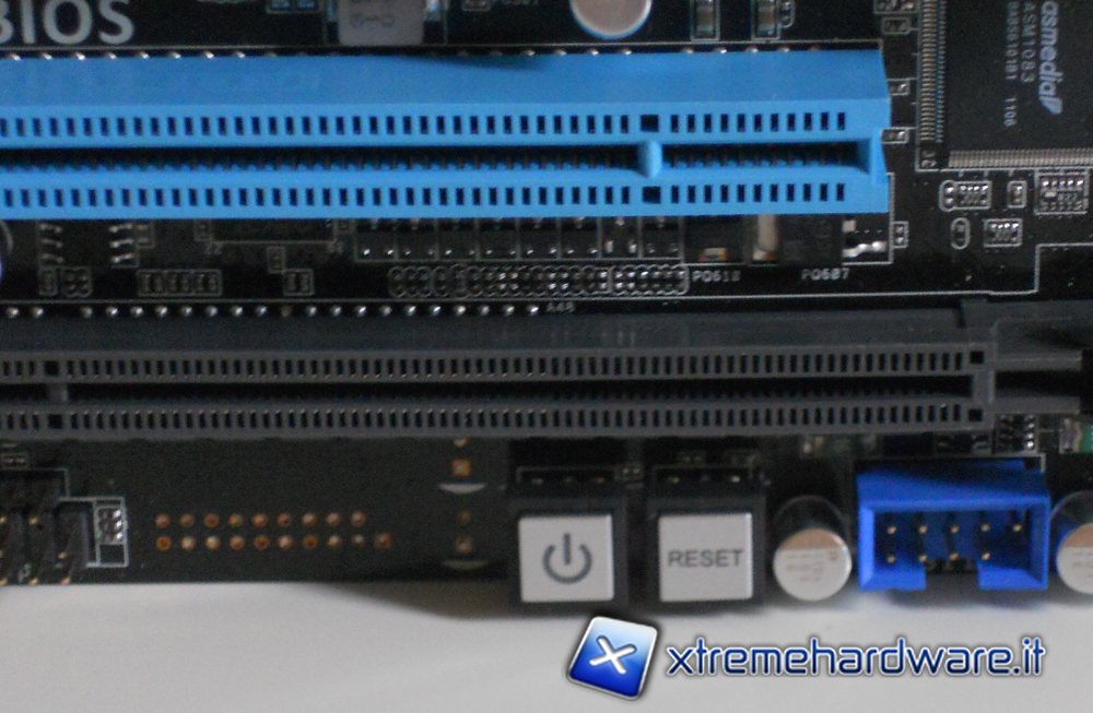Nella parte inferiore troviamo gli attacchi per 6 porte USB aggiuntive (due per ogni connettore) oltre a quella adibita all'USB bracket in dotazione che si trova vicino al 24 pin. Nell'angolo in basso a destra, è posizionato il connettore per il case dove vanno connessi i pulsanti di accensione e reset, i led di stato ed il Buzzer\Twitter, su questo connettore è ovviamente possibile utilizzare il Q-Connector in dotazione che faciliterà il montaggio dei vari cavi. Sono presenti inoltre due pulsanti on-board che servono ad accendere/spegnere il pc o resettare.