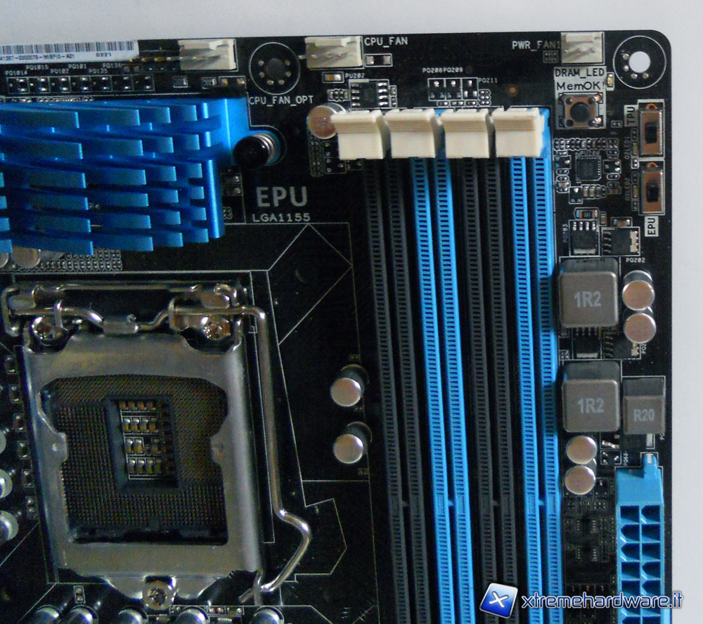 Contrariamente a quanto abbiamo riscontrato con la P8P67-M PRO, gli slot RAM hanno una colorazione nera-blu, tuttavia ci teniamo a far notare che, a differenza di altre mainboard che presentavano la stessa sequenza di colori, sul manuale della P8Z68-V PRO non vi è nessun riferimento all'utilizzo degli slot blu in caso di installazione di due moduli. Anche questa ASUS presenta un sistema di fissaggio delle RAM leggermente diverso da quello precedentemente utilizzato, i moduli, una volta installati, saranno bloccati solo da un lato e non più da entrambi. Se questa particolarità porta ad una facilità nel montaggio e nello smontaggio, dall'altra, porta ad un leggero calo di sicurezza nel fissaggio, soprattutto quando la scheda madre è montata all'interno di case piccoli e poco luminosi; risulterà infatti un pochino difficile constatare il corretto posizionamento della RAM sul lato in cui non è presente il gancio.
