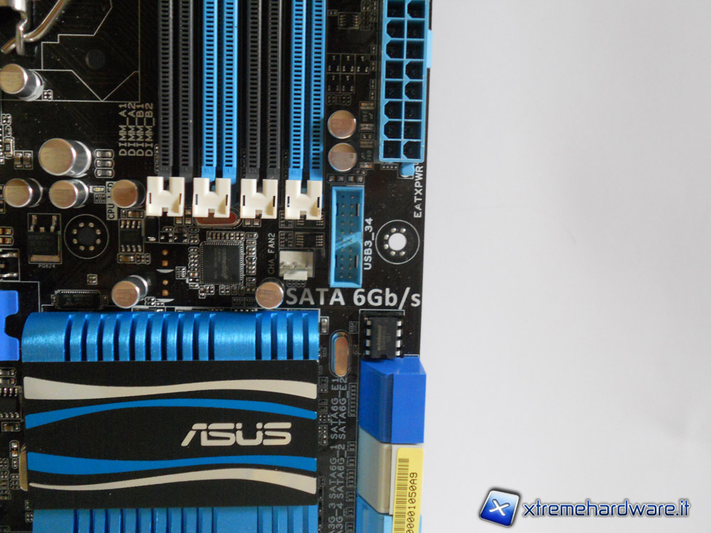 Poco più sopra sono posizionate le porte SATA gestite dal controller Intel seguite da quelle gestite dal controller Marvell, le connessioni Intel sono quattro SATA II di colore celeste e due SATA III grigie; le connessioni gestite dal controller Marvell invece sono di colorazione blu e sono entrambe SATA III.